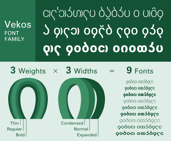 3 種類のウェイト (Regular, Bold, Thin) と 3 種類の字幅 (無印, Condensed, Expanded) の組み合わせでできる 9 個のフォントに加えて、 縦線と横線のコントラストを強くした 2 個の特殊なバリアントが用意されています。