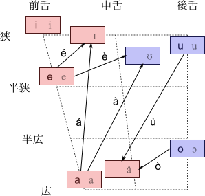 これとは別の系列として、 舌の最高部の位置と母音の高さを反対にする /aʊ/, /eʊ/, /oa̽/, /ua̽/ を追加します。