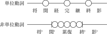 さて、 ここまでは相の確認でした。 続いて 『新生のアスペクト考』 では、 ここから定動詞や不定動詞、 そして累積動詞や反復動詞について考察を進めていきます。 その途中で、 単位動詞のモデルと非単位動詞のモデルを図示しています。