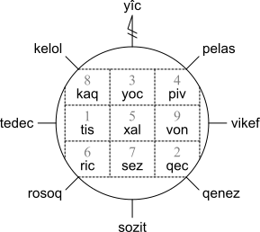子音字と数と方位は密接に関係している。 シャレイア語の子音字は全部で 20 個あるので、 2 つずつペアにすると 10 ペアできるが、 このそれぞれのペアに対し、 そのペアに属する子音のいずれかと頭文字が一致する数字が対応する。 また、 それぞれの数字に対し、 頭文字が一致する方位が対応する。 方位の配置に従って対応する数字を並べ、 中央に余った 5 を置くと、 魔方陣が完成する。