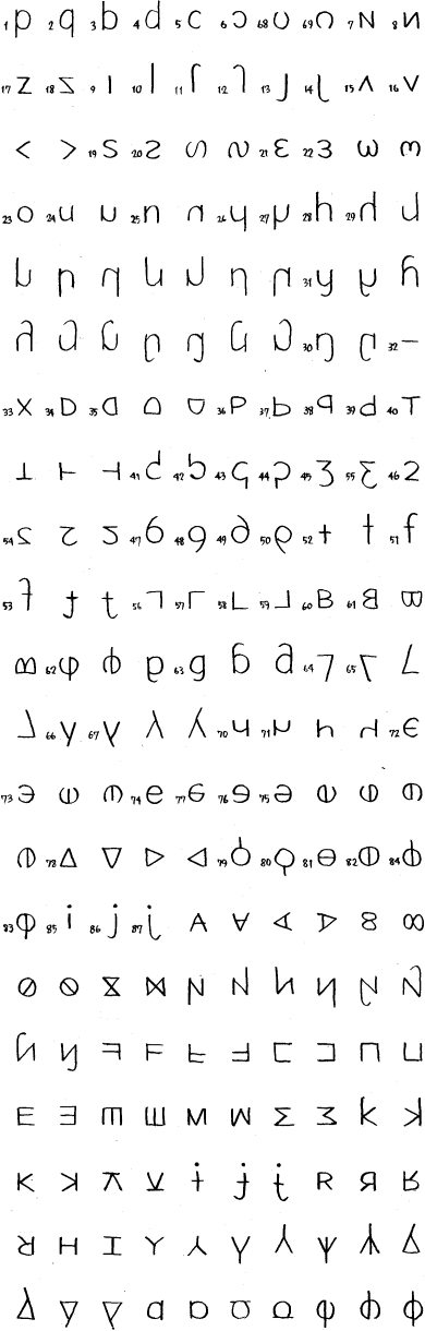 シャレイア文字を決めるときに、 文字の候補として挙げられた文字の一覧表。 2 画以下で書けるもの (点は除く) で、 基本的に円 (もしくはその一部) と直線で構成されていて、 形が複雑すぎないもの、 という 3 点に注意していろいろな図形を挙げた。 なお、 図形の左下に小さく書かれている数字は、 2 代 3 期で候補として挙げたときの通し番号である。 数字が書かれていない図形は、 5 代 1 期で文字の改定をしようとしたときに追加されたものである。