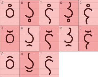 a, e, i, o, u の 5 つの字母には、 以下のように 3 種類のダイアクリティカルマークが付けられることがある。 表の中央がシャレイア文字の形を表し、 左上のラテン文字は転写を表す。
