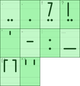 シャレイア語では、 主に以下の約物を用いる。