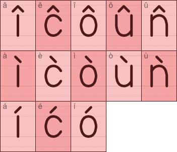 a, e, i, o, u の 5 つの文字は、 以下の 3 種類のダイアクリティカルマークがつけられたものも用いる。 小文字のみを掲載しているが、 対応する大文字にも同様の記号が用いられる。 なお、 ダイアクリティカルマークがあるものとないものは異なる文字として扱われる。